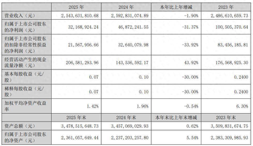 盈利能力指标方面,巨潮资讯数据显示,公司2025年毛利率为15.10%,已经是连续两年下滑。此外,公司营业利润率、净利润率、总资产报酬率也均是连续两年下滑。